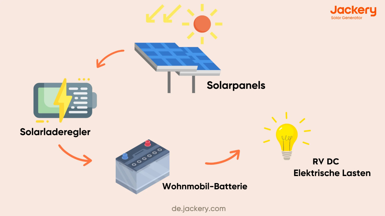 Solarpanel für Wohnmobil: Die Solarpanels für Ihr Wohnmobil werden auf dem Dach angebracht, fangen die Sonnenenergie in Solarzellen ein und leiten sie über einen Laderegler an Ihre Batteriebank weiter.