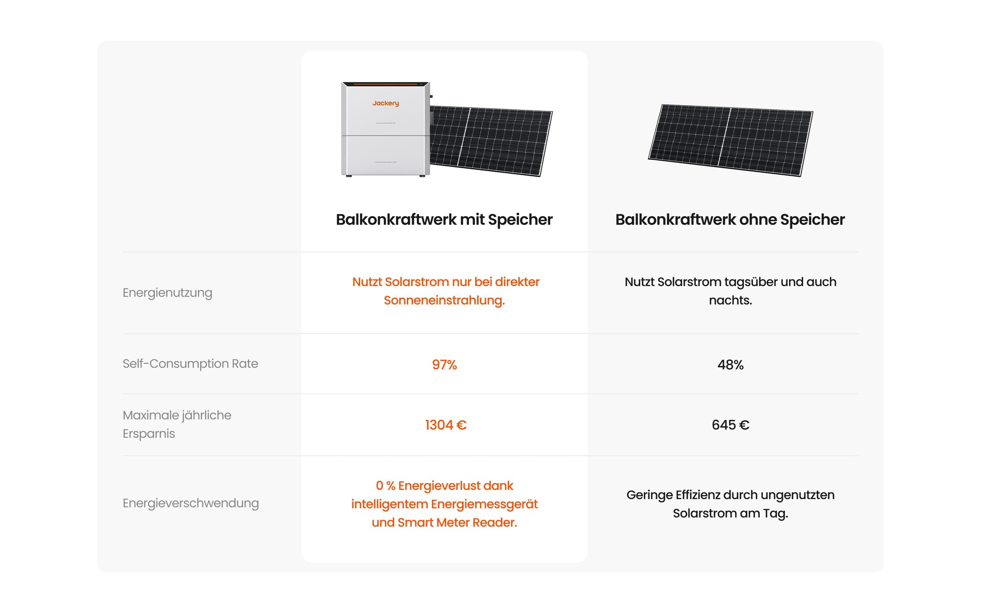 Ein Balkonkraftwerk mit Speicher steigert die Eigenverbrauchsquote deutlich, minimiert Energieverluste und verdoppelt fast die jährlichen Einsparungen im Vergleich zu einem System ohne Speicher.