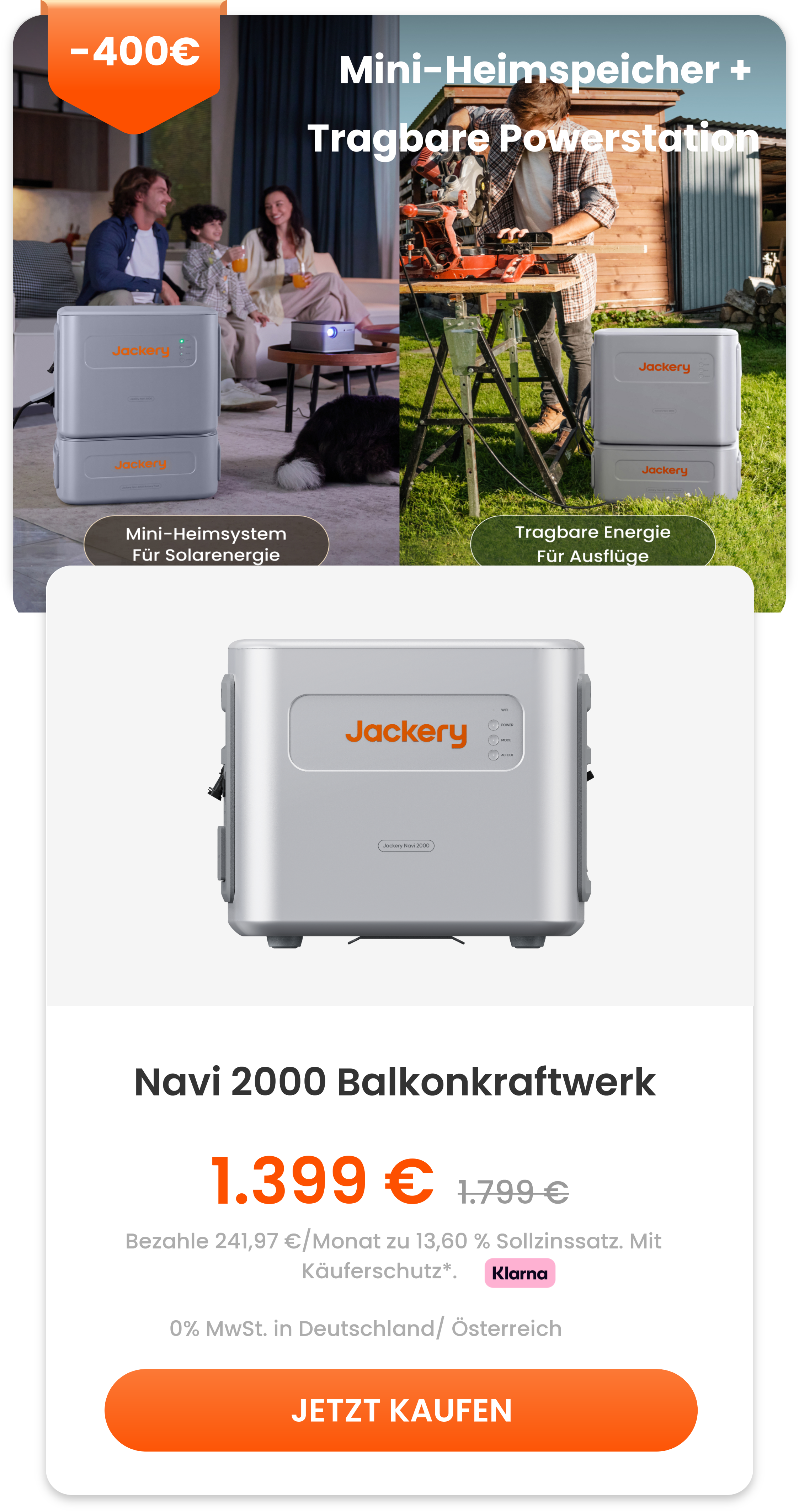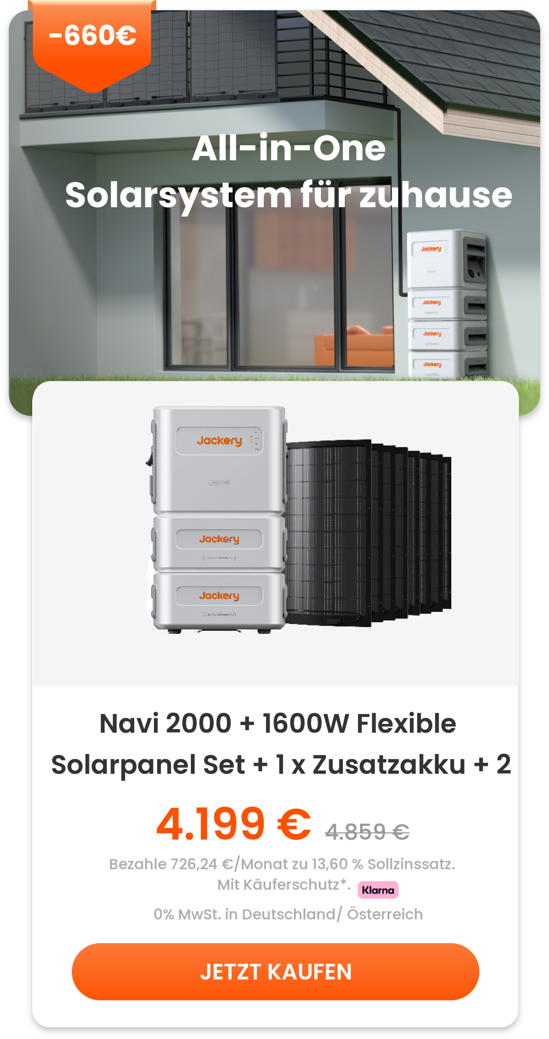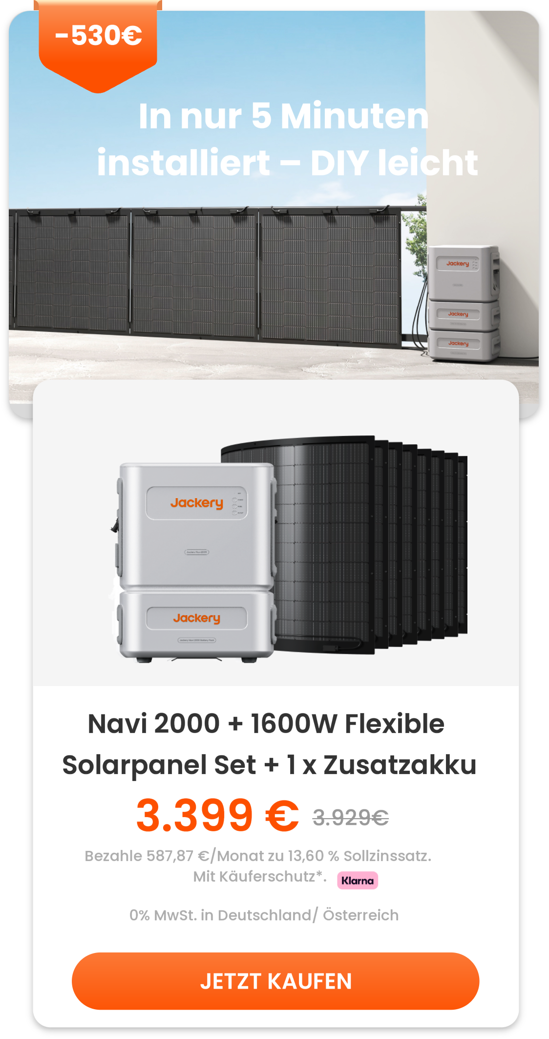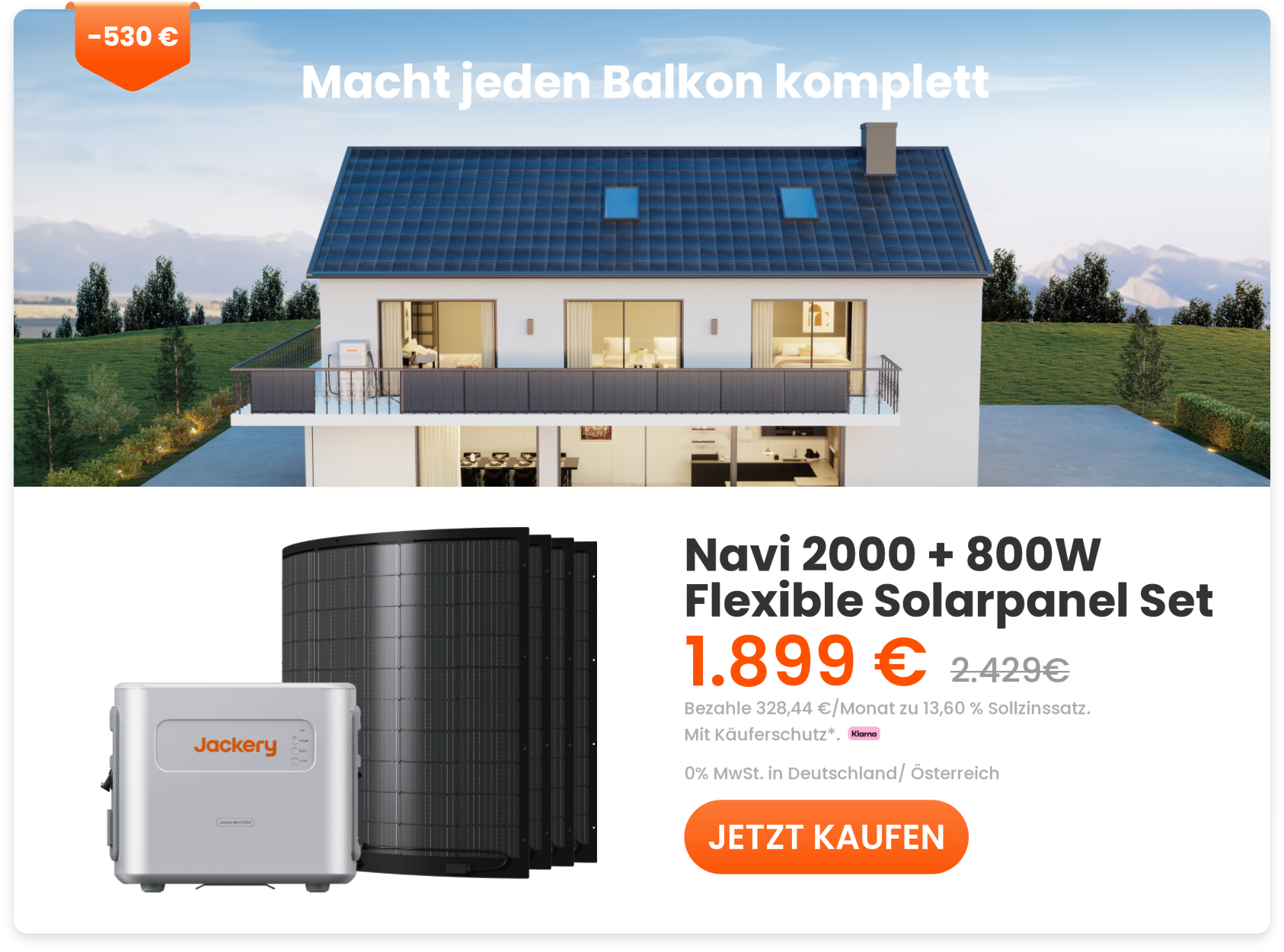 Navi 2000 erkunden >>>Die neue Generation des Jackery Balkonkraftwerks passt perfekt auf den Balkon, ins Haus und sogar in den Außenbereich. Dank der Plug-and-Play-Installation ohne Bohren ist das System in nur 5 Minuten einsatzbereit*. Die einzigartige Jackery Hybrid Charge und das preisgekrönte All-in-One-Design bringen Balkonsolarsysteme in eine neue Ära.