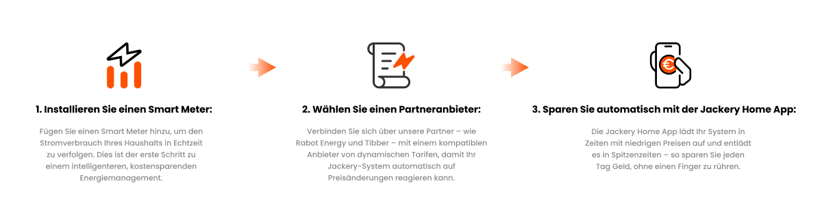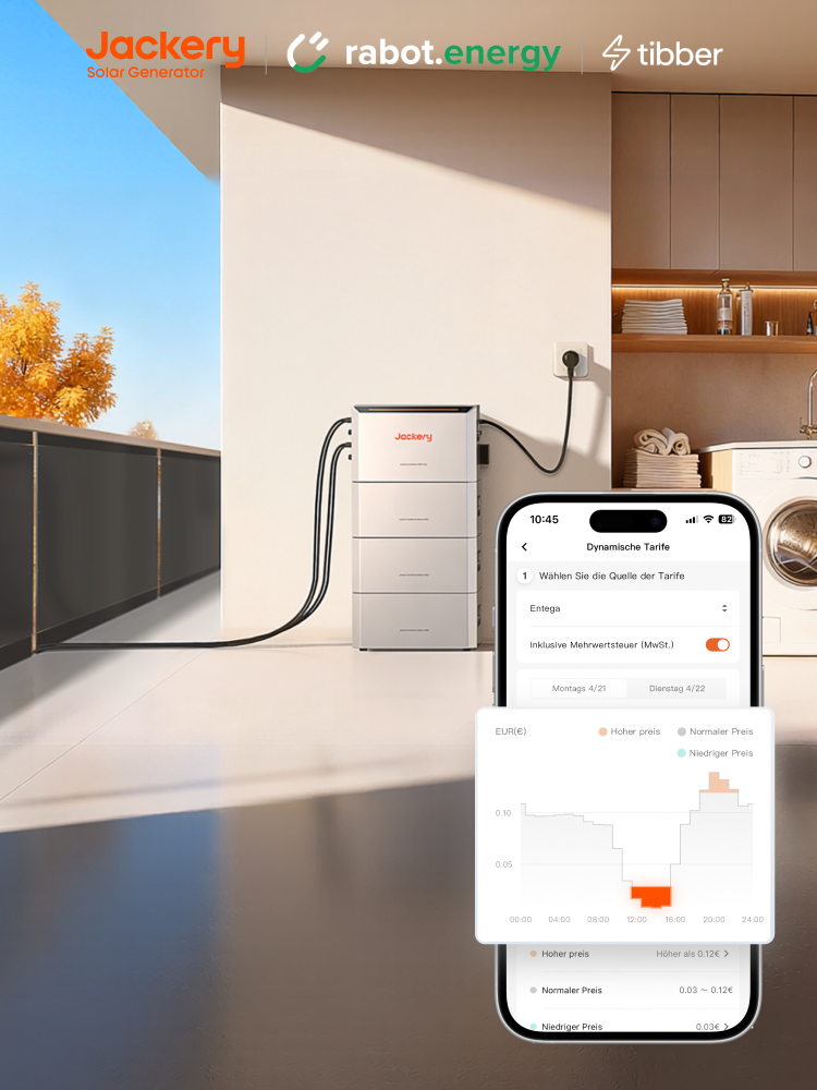 Durch Partnerschaften mit führenden dynamischen Tarifplattformen – wie Rabot Energy und Tibber – verbindet sich die Jackery Home App mit Ihrem Stromversorger und plant das Laden und Entladen intelligent.