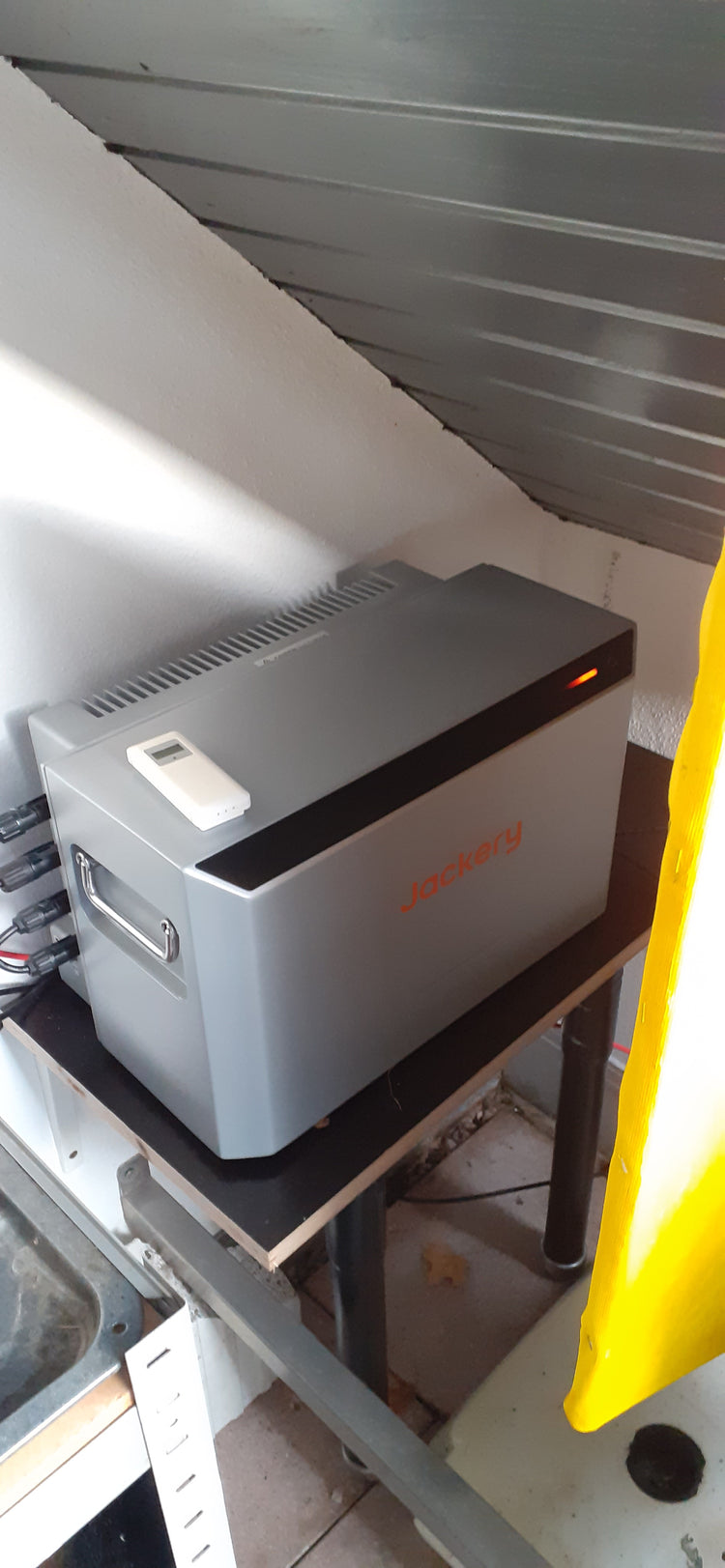 Er freut sich auf die warmen Monate, in denen die Sonne den ganzen Tag hereinströmt, der Kühlschrank eiskalt bleibt, die Ventilatoren leise summen und jeder Watt von seinen zwei Modulen direkt in die Jackery und weiter ins Haus fließt.