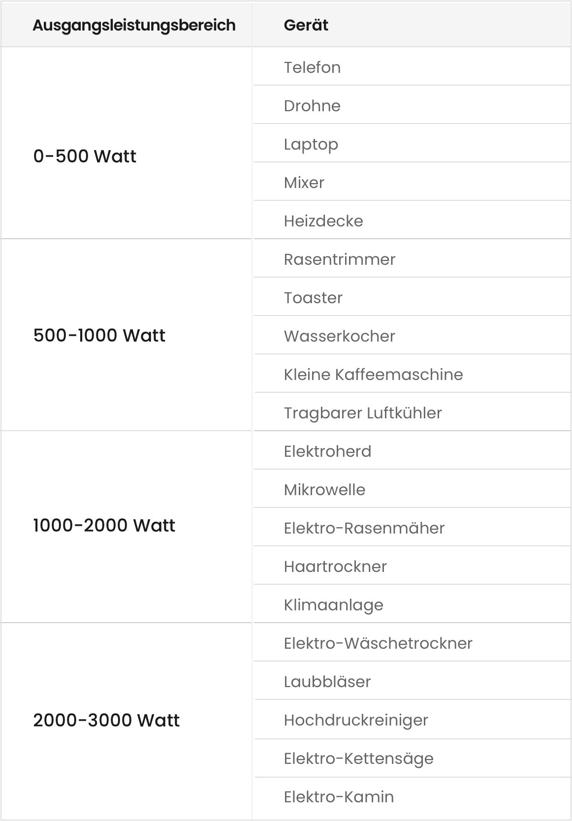 Hinweis: Diese Leistungsbereiche sind typisch für gängige Haushaltsgeräte, aber der tatsächliche Stromverbrauch kann je nach spezifischem Modell und Verwendungszweck variieren.