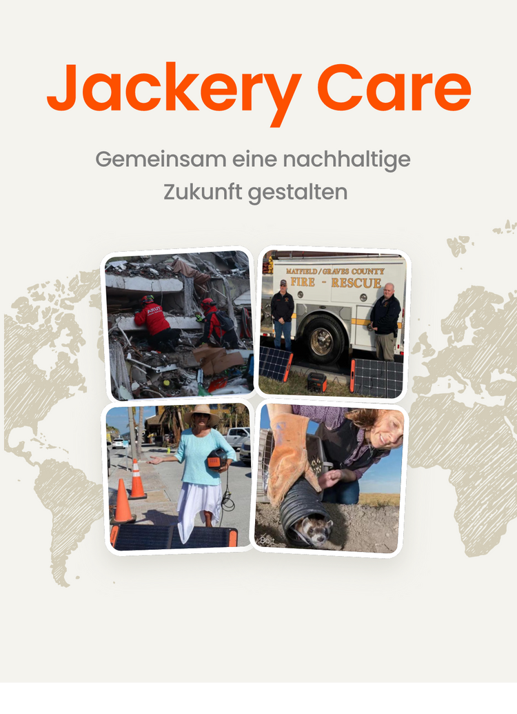Jackery Care unterstützt Katastrophenhilfe und Spendenaktionen. Mit Solarenergie für bessere Vorbereitung. Für eine sicherere, widerstandsfähigere Welt.