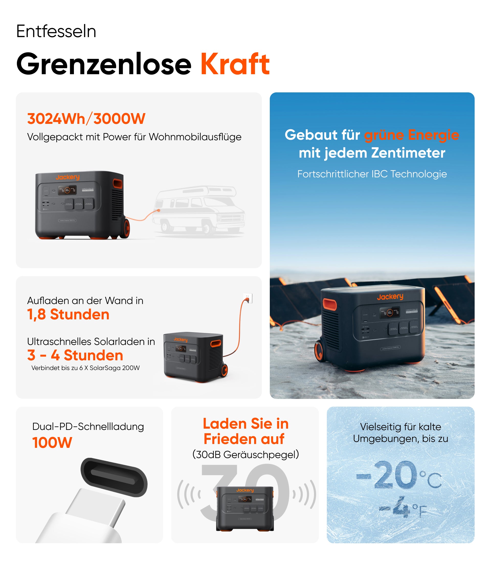 Der Jackery Solargenerator 3000 Pro ist Ihr SMART Power Master, der all Ihre Strombedürfnisse mit einer beeindruckenden Kapazität von 3024Wh und einer massiven Leistung von 3000W abdeckt. Die Explorer 3000 Pro Powerstation lädt 99% der Geräte über eine relativ lange Zeit auf und unterstützt die APP-Steuerung, wodurch sie eine ideale Stromversorgung für Wohnmobile, Camping, Glamping oder Notfälle zu Hause darstellt.