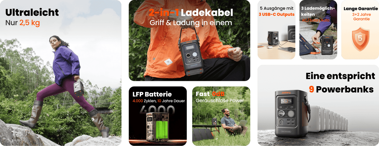 Bleiben Sie auch draußen energiebereit: Mit bis zu 100 W Solarleistung ist die Einheit in 3,5 Stunden vollgeladen – ideal für Camping, Wandern und netzunabhängigen Einsatz.