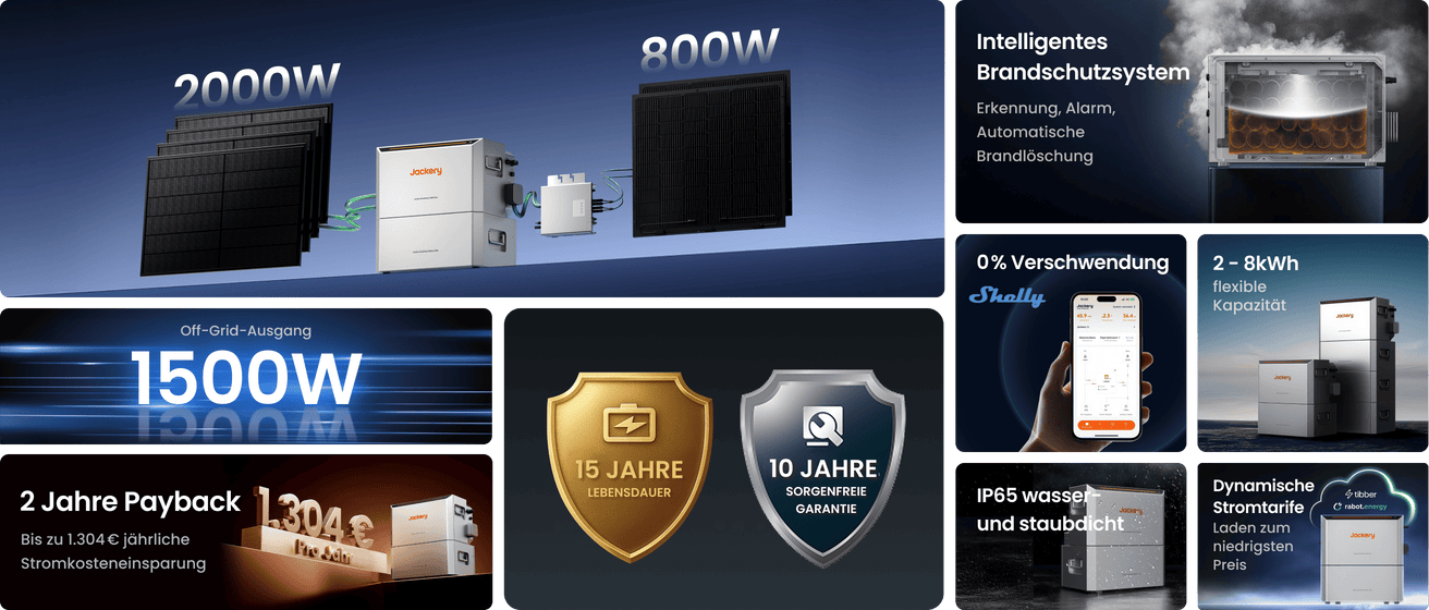 *Die jährliche Ersparnis von 1304 € basiert auf folgendem Systemaufbau: Jackery HomePower 2000 Ultra, drei Erweiterungsbatterien (jeweils 2 kWh), 2800W Solareinspeisung, Smart Meter und vier Halterungen.