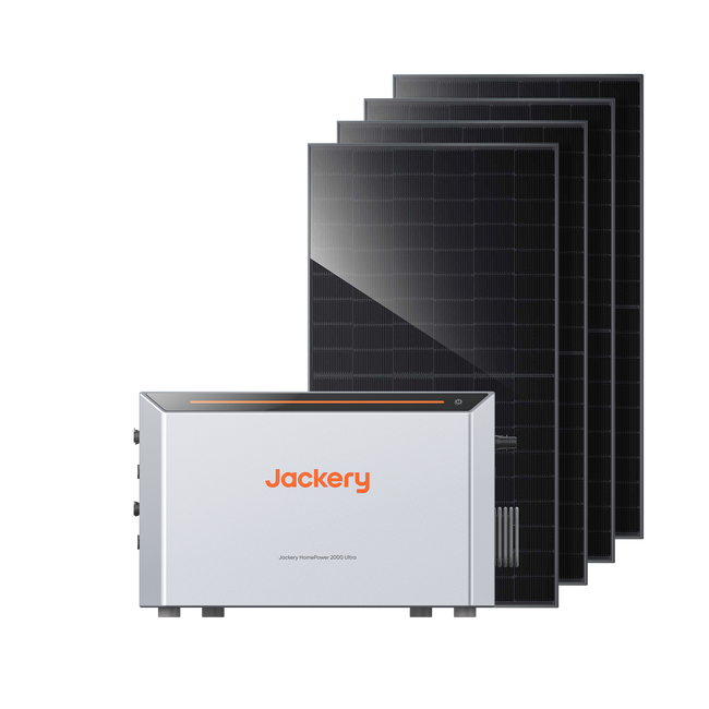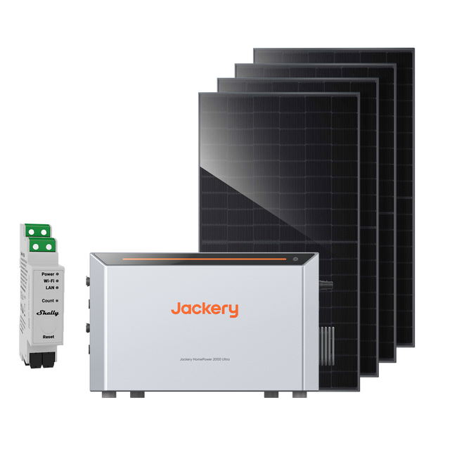 Jackery HomePower 2000 Ultra, 2800W Solareinspeisung, Smart Meter und vier Halterungen.