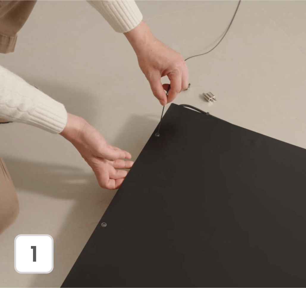 Installieren Sie nun das erste Solarpanel, indem Sie beide Enden mit Seilen sichern. Zuerst die Seilklemme leicht anziehen. Dann das Seil durch die Ösen und den Spanner führen.