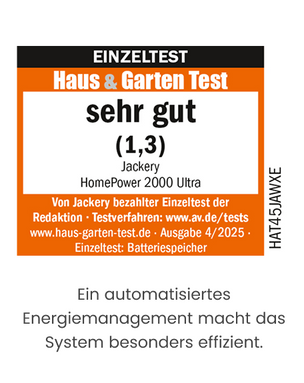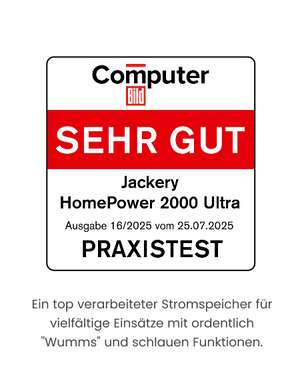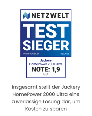 *Die jährliche Ersparnis von 1304 € basiert auf folgendem Systemaufbau: Jackery HomePower 2000 Ultra, drei Erweiterungsbatterien (jeweils 2 kWh), 2800W Solareinspeisung, Smart Meter und vier Halterungen.