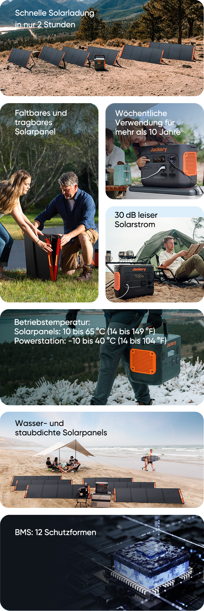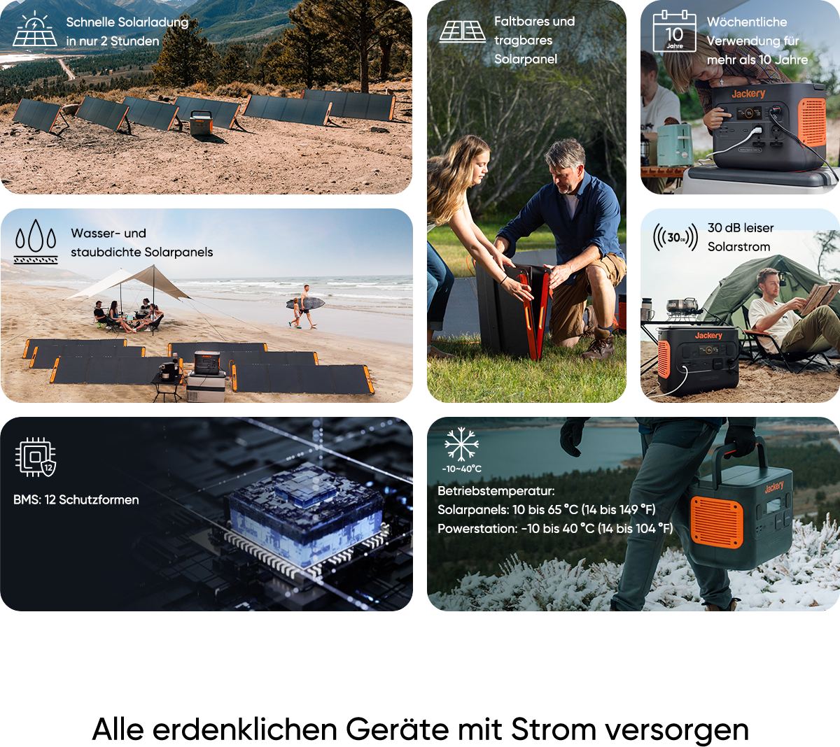 Die Powerstation verfügt über Wärmeableitung und Hochtemperaturschutz, für eine erweiterte Lebensdauer. Der Wasserschutz IP67 ermöglicht es dem 200w Solarpanel, rauem und nassem Wetter standzuhalten.